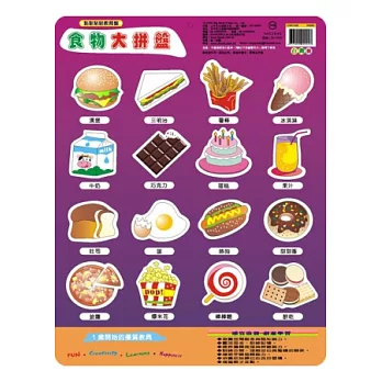 《食物大拼盤》教導孩子認識日常生活中的食物,背景圖特別保留有黏貼組件的灰色背影圖像,藉以引導孩子學習正確的配對。透過16個可以自由拆卸的可愛圖像配對、黏貼,讓孩子可以不斷地反覆學習、認知,在遊戲中訓練記憶、學習空間概念、加強手眼協調與感官統合能力,理解部份與整體的關係,學習收拾歸位,養成良好的生活習慣。其特殊的學習方式被美國加州兒童發展學院視為最佳商品玩具的條件之一。